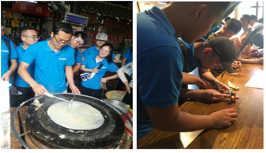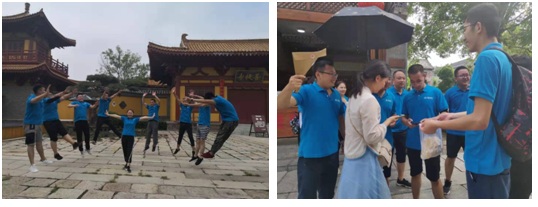 此次拓展培訓突破以往傳統方式,增加了更多真人體驗活動環節,活動在古城內進行。各小組在出發前,分別領取任務書,根據地圖、任務書要求相繼完成各項活動,部分任務需和古城內游客互動完成。一種為主線任務,另一種為機動任務,每完成一項任務,培訓師根據各組完成的數量及質量統計積分,獲得積分最多者為獲勝隊,并獲得相應獎勵。如主線任務有雷陣、魯班解鎖、攤煎餅、天女散花以及定點尋找神秘人完成神秘任務等;機動任務有愛心九宮格、網紅“抖”(拍攝經典抖音短視頻)、無中生有(途中尋找各種資源,拼接公司LOGO)、安得標兵、“打劫”(盡可能多的尋找游客錄制一段對公司的祝福語)、花樣年華微電影(涵蓋公司相關元素及積極向上宣傳語)、臺兒莊密碼等。